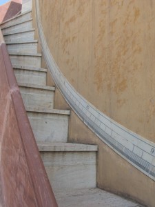 While in India this past February, I made a visit to the Jantar Mantar in Jaipur. Conceived as the embodiment of astronomical instrumentation, the Jantar Mantar is a series of building-sized measuring devices set in a park. The structures are a wonderful example of the intertwining of design and function. The image here shows measuring devices integrated into the walls in a beautiful way. Like other structures in the park, this building’s carved stone details arc to follow the path of the sun, taking advantage of cast shadows to enable readings – whether of time or of the location of planets.